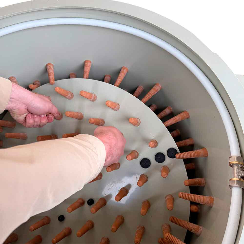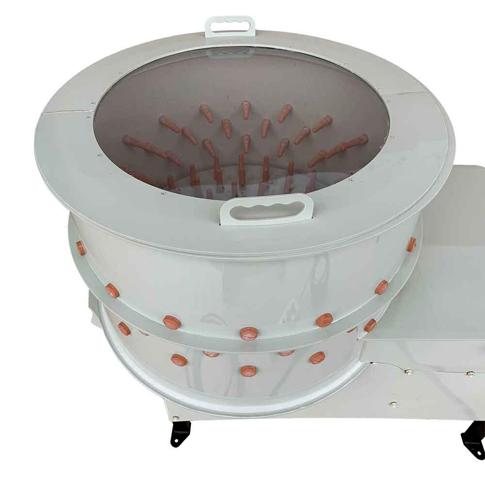 Рабочими органами машины являются бильные пальцы, которые установлены в стенку барабана и во вращающийся диск. Ощипывание тушки птицы происходит посредством воздействия бильных пальцев на перья птицы, диск вращает тушку птицы, а бильные пальцы мягко и быстро зацепляют и удаляют перья, не повреждая тушку. Бильные пальцы изготовлены из натурального каучука, что позволяет им долгое время не терять эластичность и рабочие свойства;